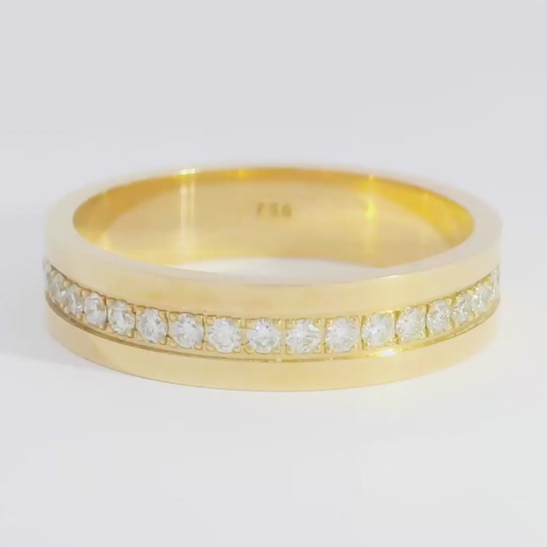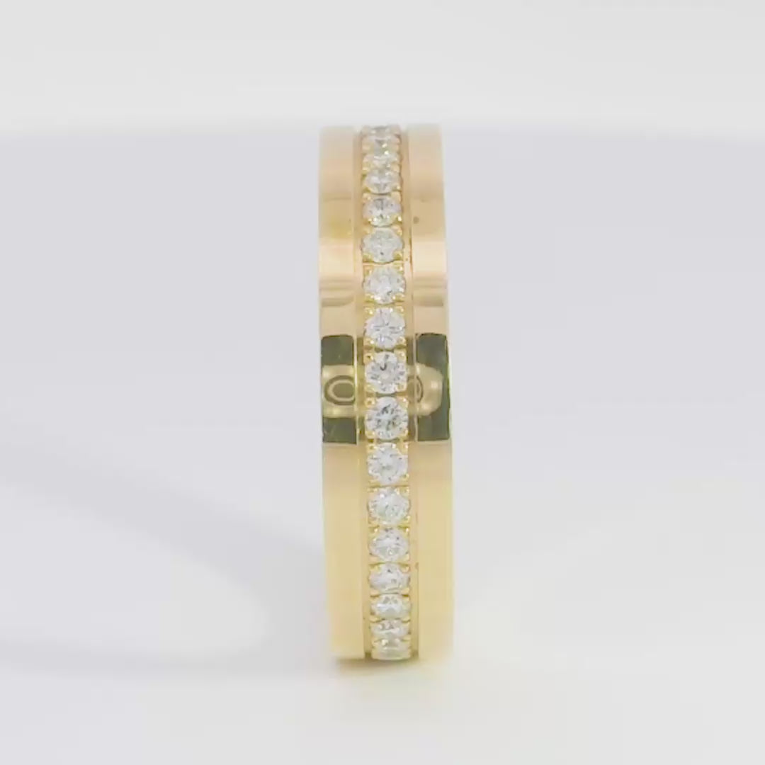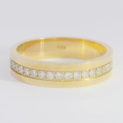 This bold 5mm cigar band features a substantial profile with a modern twist, showcasing a line of diamonds meticulously inset into the band. The flush setting provides a sleek, smooth surface while allowing the diamonds to deliver a sophisticated and subtle sparkle. This ring is perfect for a confident statement or a contemporary wedding band.