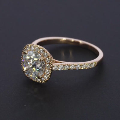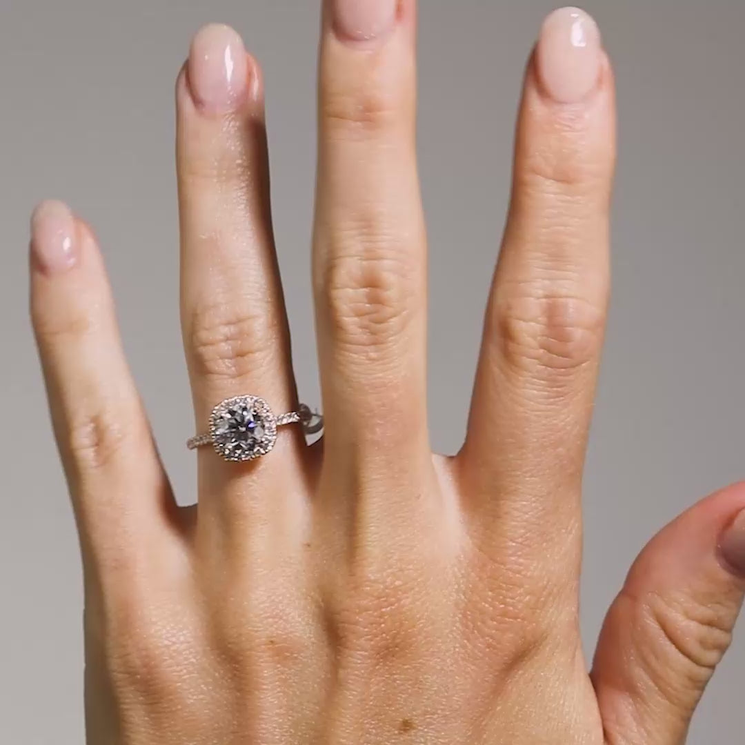 This timeless engagement ring features a brilliant round-cut center diamond encircled by a dazzling halo and band of smaller diamonds. This classic design enhances the center stone's sparkle and creates a captivating symbol of love.