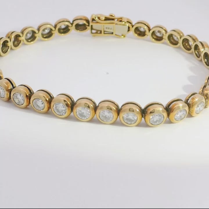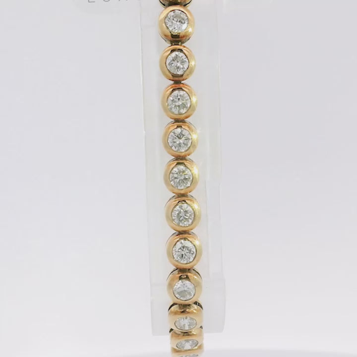 Elegant and timeless, this tennis bracelet features sparkling round/brilliant cut diamonds that are individually set in sleek bezels along an eye-catching chain. This sophisticated piece offers comfortable wear and a continuous line of understated brilliance.