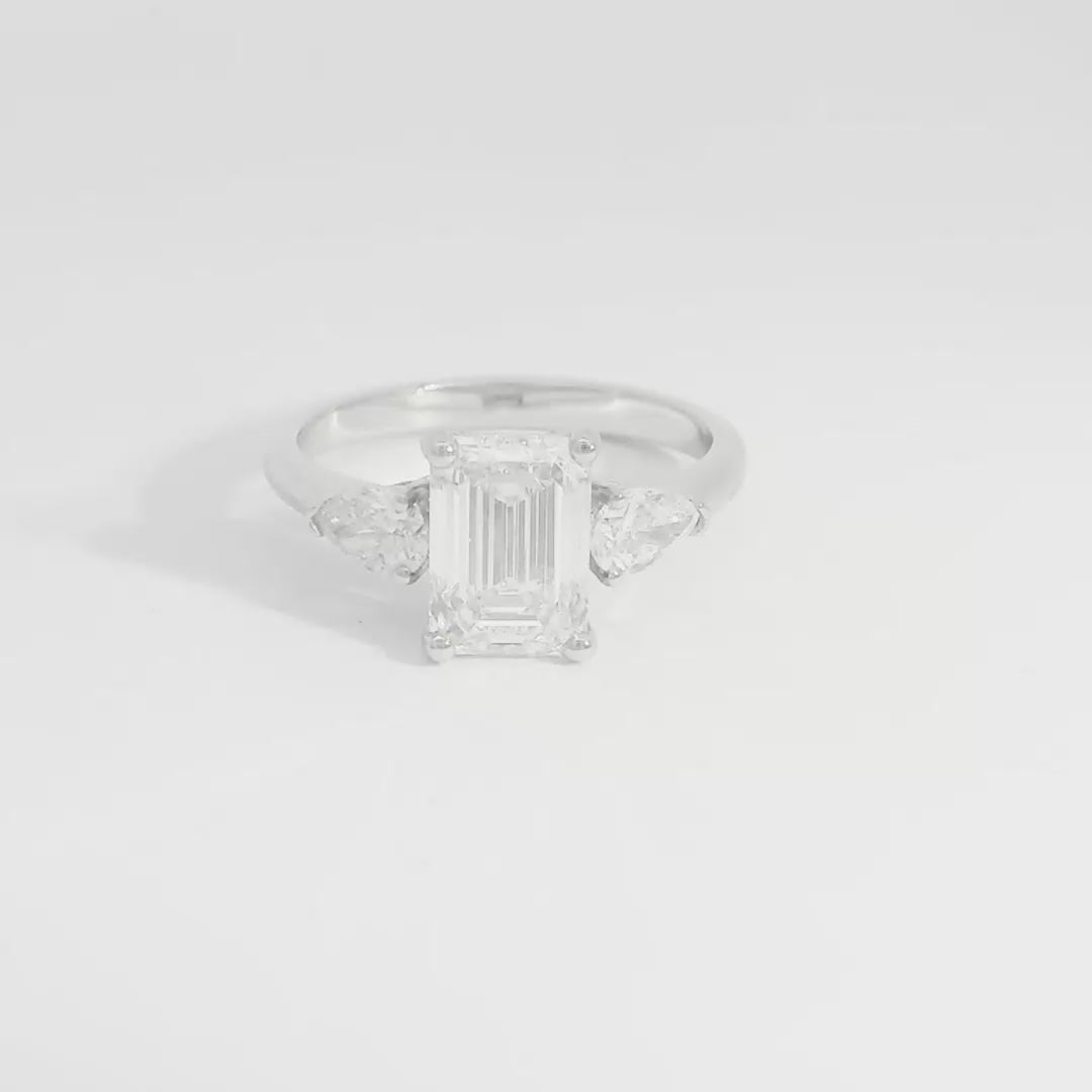 This sophisticated engagement ring features a stunning emerald-cut centre stone flanked by elegant tapered pear-shaped accent diamonds. The classic design highlights the unique facets and brilliance of each carefully chosen stone.