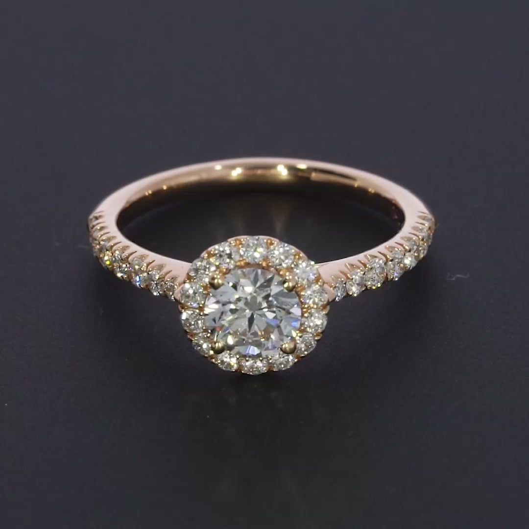 A true masterpiece of modern romance, featuring a 0.68ct lab-grown round brilliant centre diamond, accompanied by a dazzling halo of smaller lab-grown round brilliant diamonds which extend down a half-pave band.