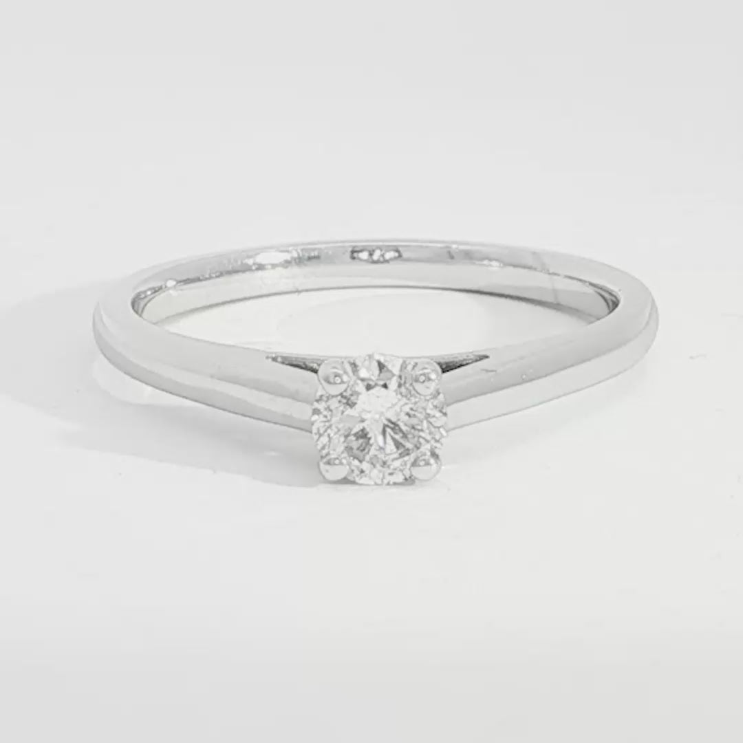 This refined engagement ring features a dazzling round brilliant-cut diamond, celebrated for its exceptional fire and light return. The elegant cathedral setting elevates the centre stone for a prominent display, while the design's overall 0.35 total carat weight offers a beautiful sparkle that doesn't compromise on classic style.