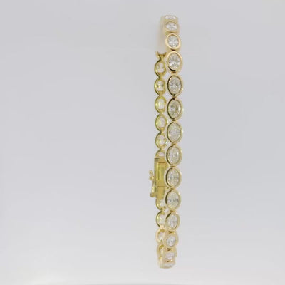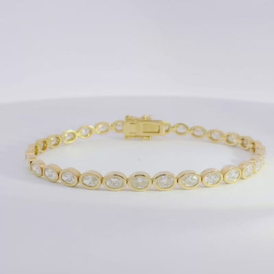 This elegant tennis bracelet showcases a continuous line of stunning oval-cut diamonds, each meticulously encased in a sleek bezel setting. This contemporary design not only accentuates the unique elongated shape and brilliance of each oval diamond but also ensures a smooth, secure, and comfortable fit for everyday wear. It's a sophisticated and modern take on a classic, offering timeless sparkle with a distinctive silhouette.