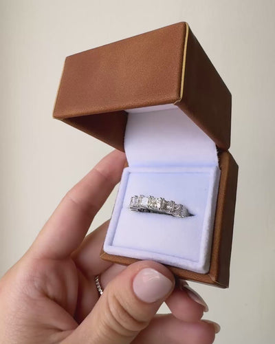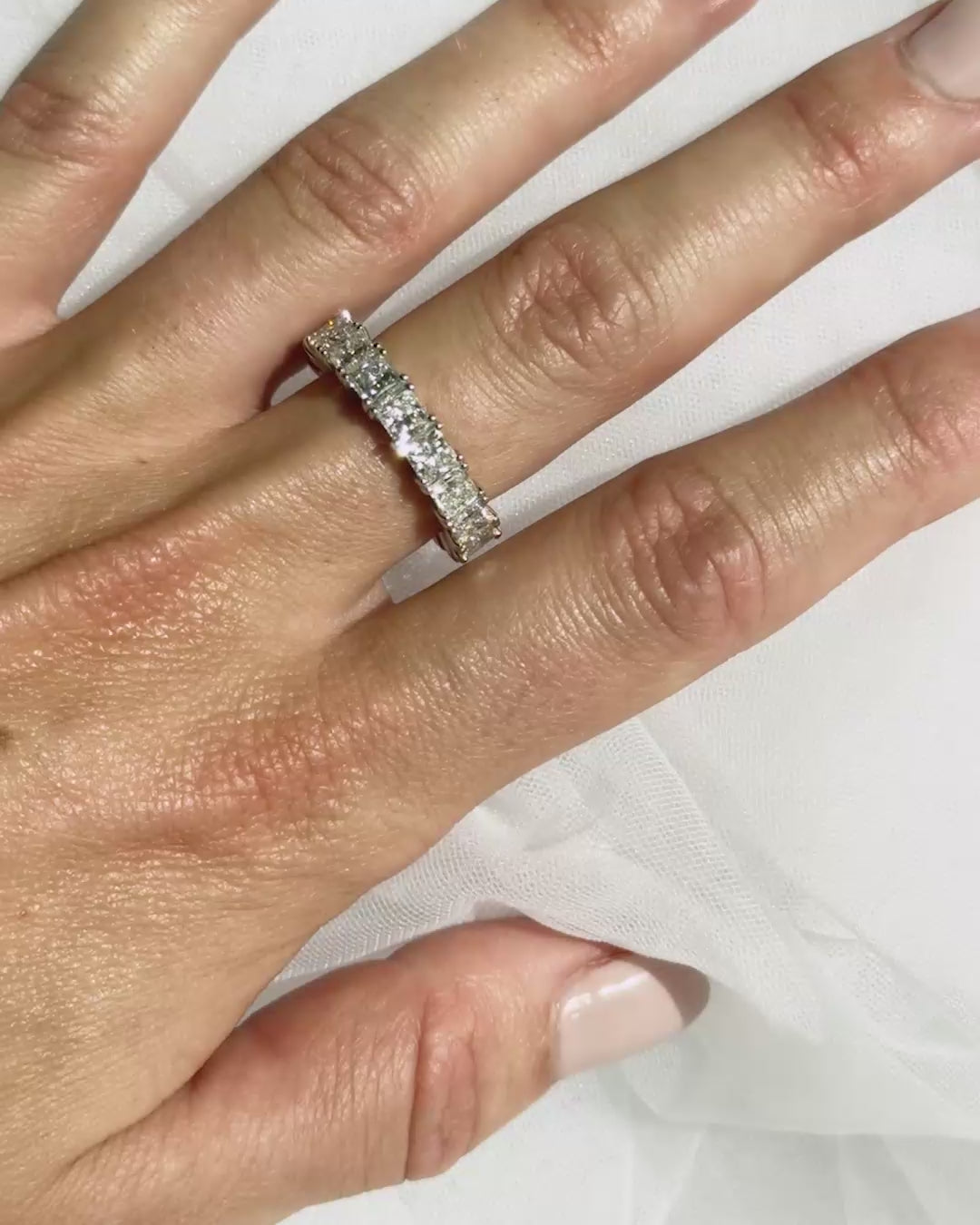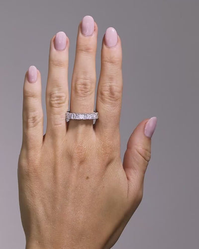 This sophisticated eternity band is fully pavé-set with meticulously cut princess diamonds, creating a continuous line of modern brilliance. A symbol of enduring love, this ring offers a sleek and elegant sparkle from every facet.