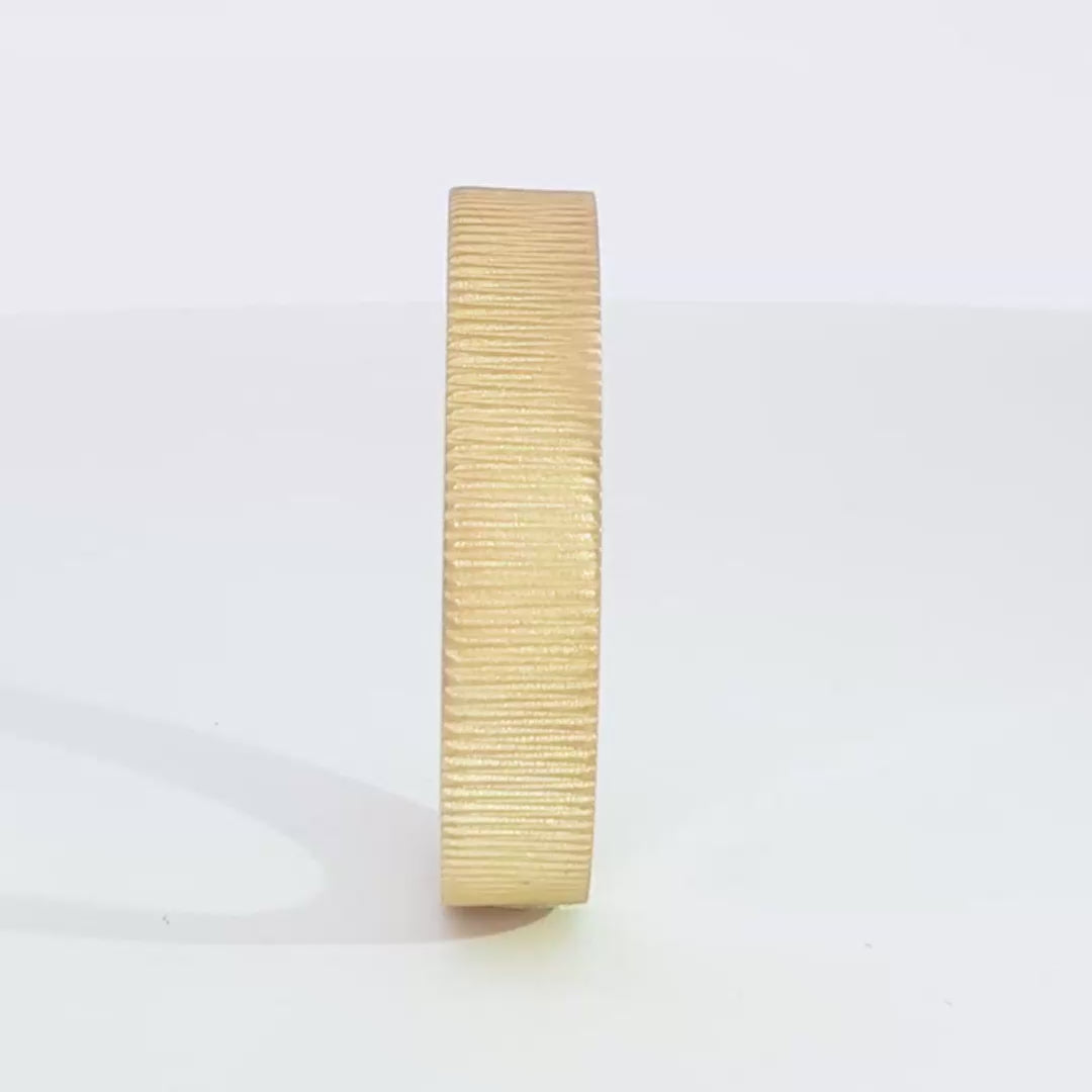 This distinctive cigar band features a substantial profile with a confident 4.2mm width and a solid 1.6mm height. The striking ribbed texture adds sophisticated dimension and visual intrigue, while the flat interior ensures a smooth, stable fit for confident, daily wear.