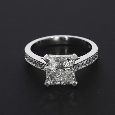 This captivating engagement ring features a stunning princess cut diamond, celebrated for its modern square shape and brilliant sparkle. The elegant center stone is beautifully complemented by a band adorned with additional dazzling diamonds, creating continuous brilliance and enhancing the ring's overall radiance. This design offers a sophisticated and timeless symbol of love.
