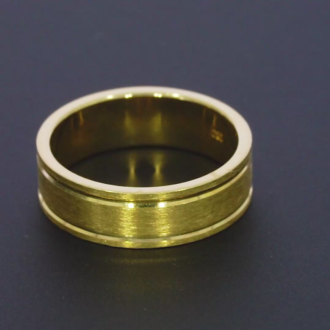 This sophisticated solid, brushed gold wedding band features a distinctive "two channel" design, with two parallel grooves expertly carved into the metal. These subtle yet stylish channels add depth and modern appeal to the band's classic form, creating a unique texture while maintaining its timeless elegance. It's a perfect choice for those seeking a band with understated detail and lasting quality.