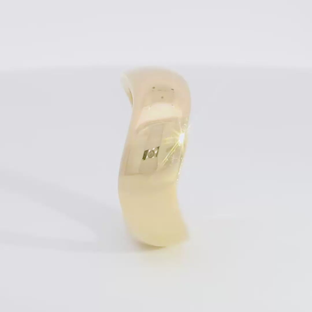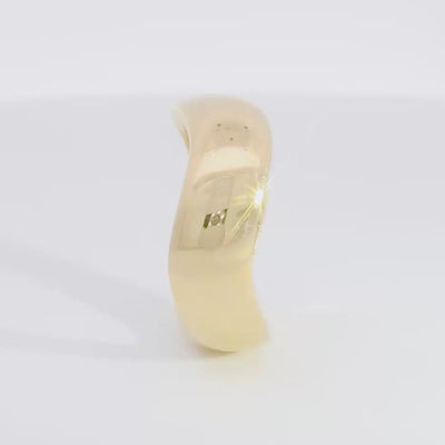 This 18k gold band offers a modern take on a classic ring. Featuring a gracefully curved wave-like finish and highly polished surface. At 6.3mm wide, it provides a noticeable yet comfortable presence on the hand. Its semi-hollow design ensures a lightweight feel without compromising on the luxurious gleam of 18k gold.