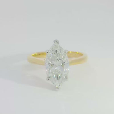 This striking engagement ring features an elegant marquise-cut centre stone set in a luminous white gold setting, beautifully contrasted by a warm yellow gold band. The elongated shape of the diamond creates a sophisticated and finger-flattering look. This ring also allows for versatility with mix and match metals for wedding and anniversary bands.